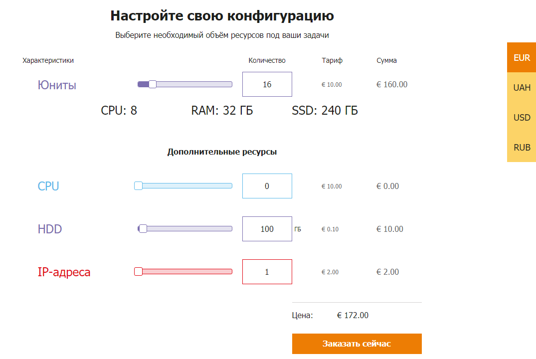 Учитывая задачи и пожелания, было решено развернуть виртуальную машину на базе облачного решения TuchaBit+ в конфигурации 16 юнитов. По ресурсам, это: